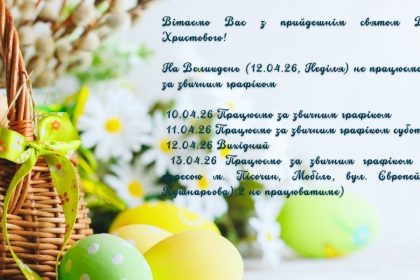 На Великдень (12.04.26, Неділя) не працюємо. Інші дні, за звичним графіком